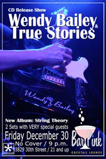 “String Theory is the debut album from Wendy Bailey and True Stories, featuring lead guitarist and vocalist Wendy Bailey, bassist Billy Fritz, guitarist Bart Mendoza and drummer Danny Cress. The album was recorded at Earthling Studios with Mike Kamoo (The Stereotypes, The Loons etc) at the board. The album is indie rock by default, but actually covers a lot of stylistic ground, with songs penned by both Bailey and Mendoza, as well as lead vocals from both.” Guests on the album include Purity of Essence keyboardist Ed Kornhauser and Echo Revolution front man Lee Harding on background vocals